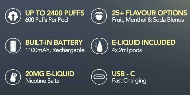 Each pod contains 2ml of 20mg e-liquid, which provides a smooth throat hit and rapidly fulfills cravings. There are many different fruit, menthol, and soda mixtures to choose from when it comes to flavor. Four Air pods are included with your kit: